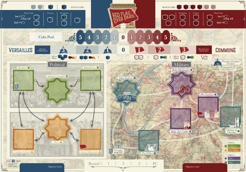 Le plateau possède une zone militaire et une zone politique. Ces deux zones sont divisées en plusieurs parties (Institutions politiques, Opinion publique, quartiers de Paris et les forts à la périphérie de la ville). En plus de contrôler les espaces militaires et politiques et de remplir vos objectifs pour marquer des points de victoire, vous devrez gérer votre élan. Versailles doit collaborer avec l'envahisseur prussien pour constituer une armée qui rétablira l'ordre dans la capitale. De l’autre côté, la Commune doit construire un élan révolutionnaire robuste pour s'assurer que la population reste mobilisée après des mois de siège et de pénurie alimentaire.