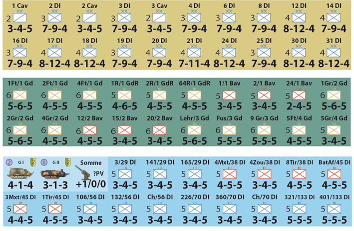 While the basic rules inS18 are identical to those in Marne 1918(with the exception of the air rules, which have been completely revised), the advanced rules will be very different. The principal reason is the length of Operation Michael, about fifteen days, which does not give an opportunity for the campaign management rules of Marne 1918 to be used.