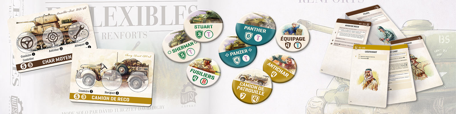- 28 pions (3 Combattant LRDG, 3 Combattant italien, 3 Véhicule américain, 3 Véhicule allemand, 1 Entrée américain, 1 Entrée allemand, 8 Mine, 2 Commandement, 4 Terrain Difficile)
